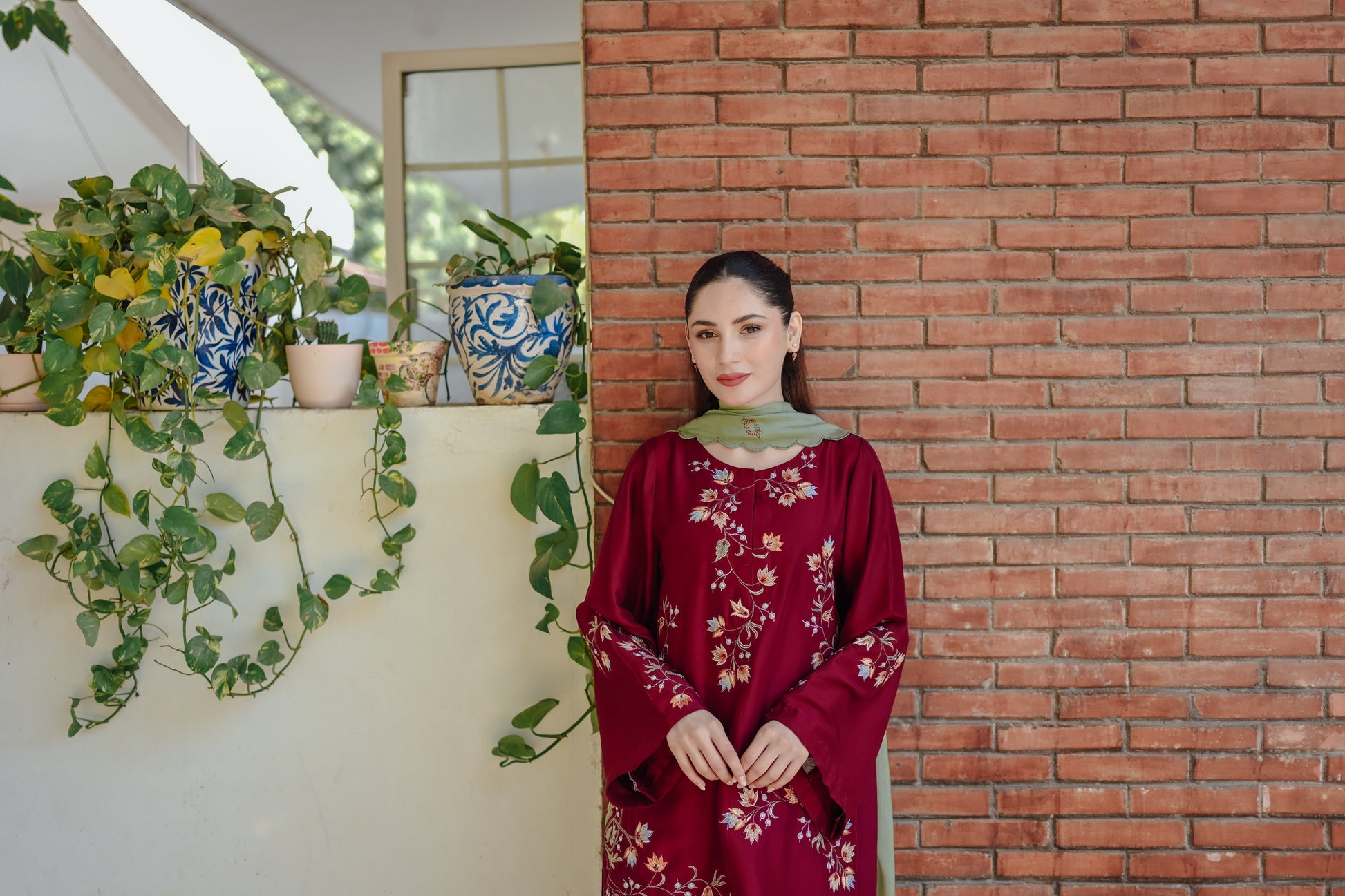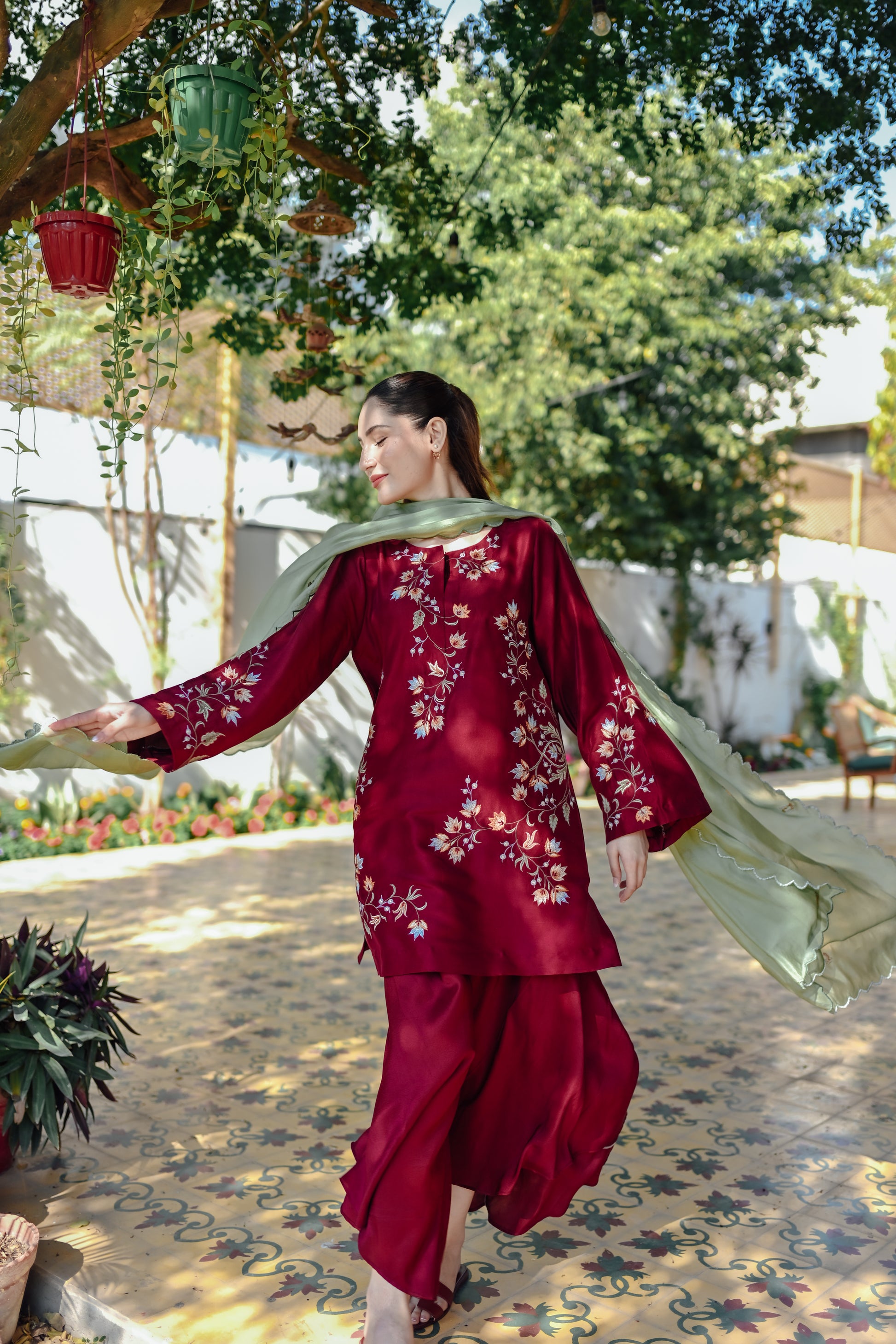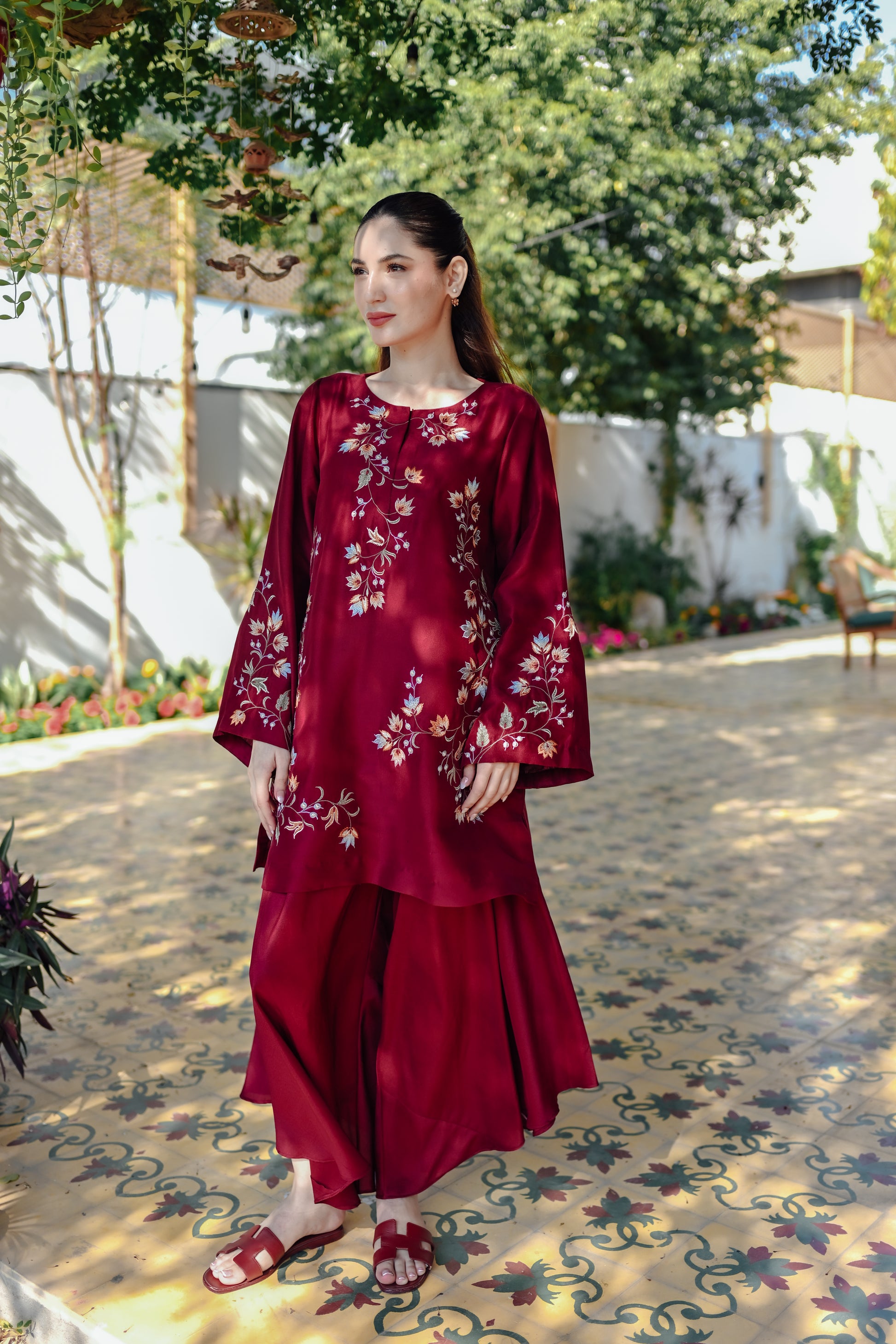 Our stunning maroon ensemble, adorned with intricate multi-hued floral embroidery, is paired with matching free-flowing pants, blending elegance and comfort for Eid celebrations.